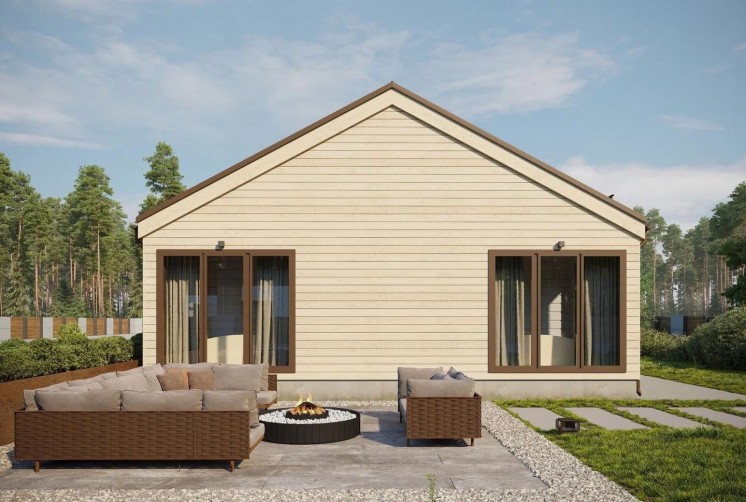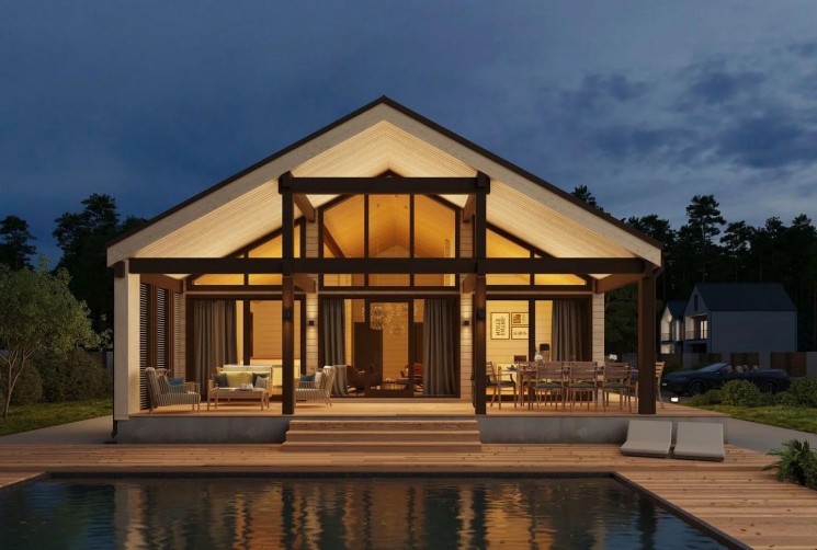 Один из примеров такого дома – одноэтажный дом по проекту Barn. Он отличается своей планировкой, которая включает в себя кухню-гостиную, три вместительных спальни, санузел, техническое помещение и просторную террасу. Большие окна, пропускающие много света, делают дом очень энергоэффективным, а также придают ему современный вид.