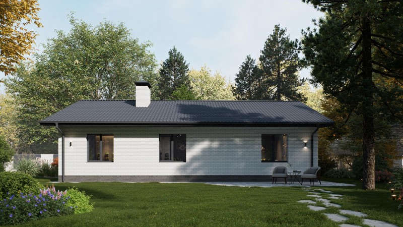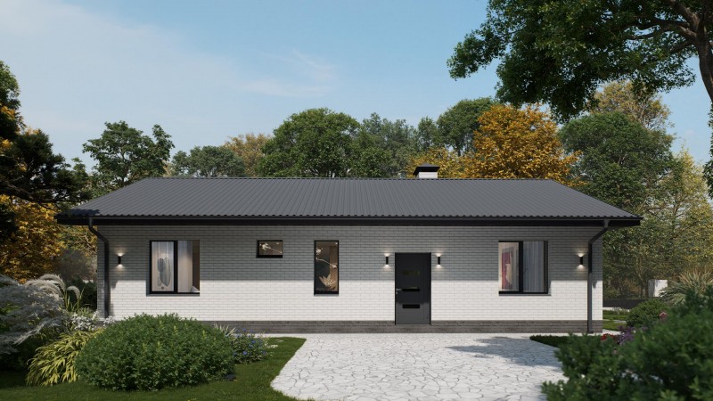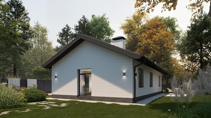 Одноэтажный дом с двускатной крышей, представляет собой классический вариант загородного дома. Двускатная крыша гармонично сочетается с окружающим ландшафтом, а деревянные вставки из лиственницы придают дому эстетичный вид.