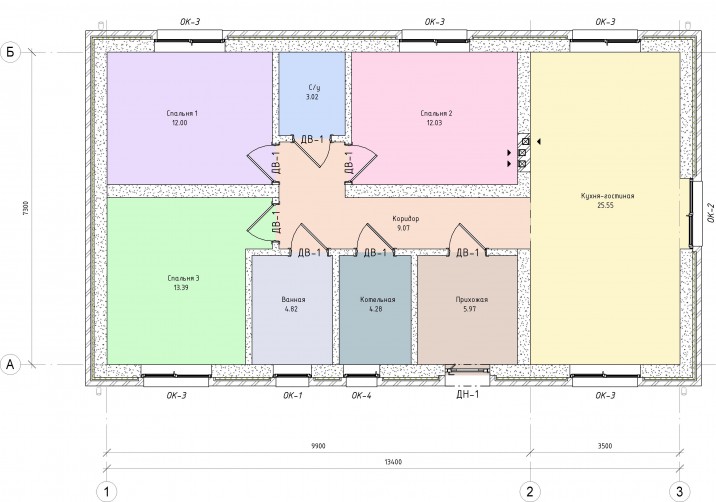 Объемо-планировочные решения дома вмещают просторную кухню-гостиную с большими панорамными окнами, три спальни, два санузла и просторную прихожую.
